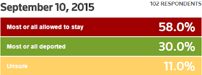 Over the summer, Reuters approached the issue in the most straightforward manner I've ever come across. In terms of fleshing out public sentiment, the approach is bar none. Respondents were asked about what should be done with illegal immigrants in the US. Only two committal answers--"deport most or all of them" and "allow most or all of them to stay"--along with a third "unsure" cop-out option, were offered as responses.