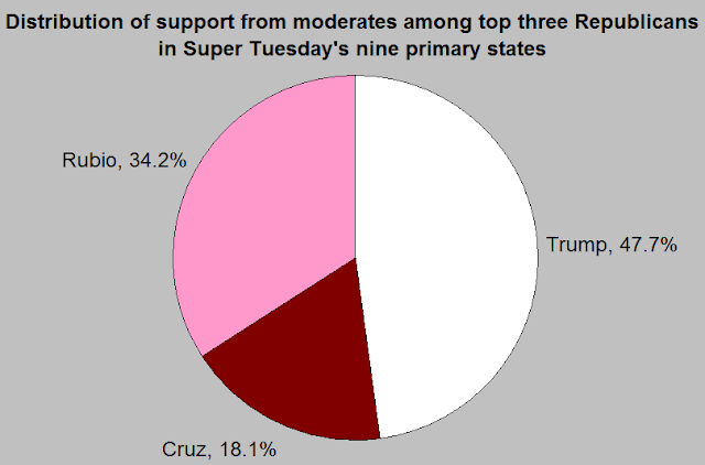 Trump appeals far more to moderates than the rest of the Republican field does. He and Cruz are almost even among voters who identify as conservative. Rubio gets crushed by both Trump and Cruz among conservatives, but has almost twice the moderate support that Cruz enjoys (while Trump has nearly three times Cruz's moderate support).