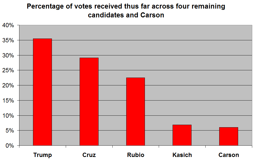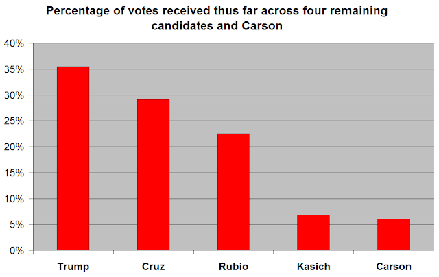 Compare this to candidate shares of total votes received among the four still in the race and Ben Carson going back to Iowa, where Trump's lead, while comfortable, isn't dominant: