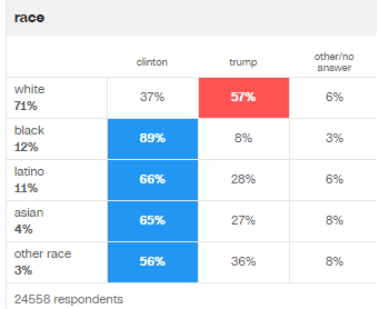 Note that if you breakdown Hillary's coalition of voters by ethnicity, almost half (but not quite) of her voters are non-white. By 2020, it is likely that the coalition of voters that vote for a Democratic Presidential nominee will be majority non-white.