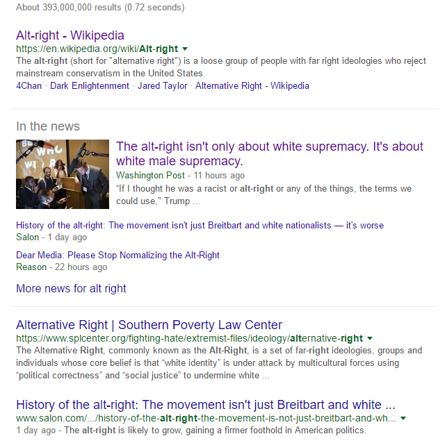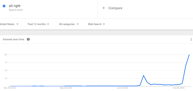 ... then Richard Spencer has given the Alt Right a lot of good publicity. He has in fact trebled the interest Hillary was able to generate when she mentioned the movement in a speech back in August: