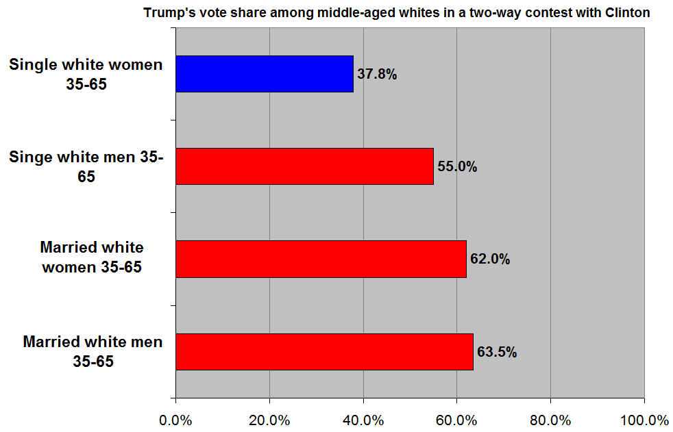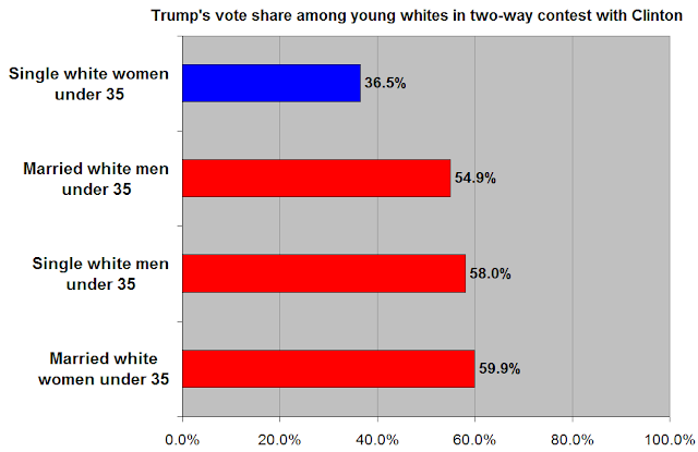 Young single white men were marginally more supportive of Trump than young married white men were, though the difference is within the margin of error. The difference between young single and young married white women, however, is yuge.
