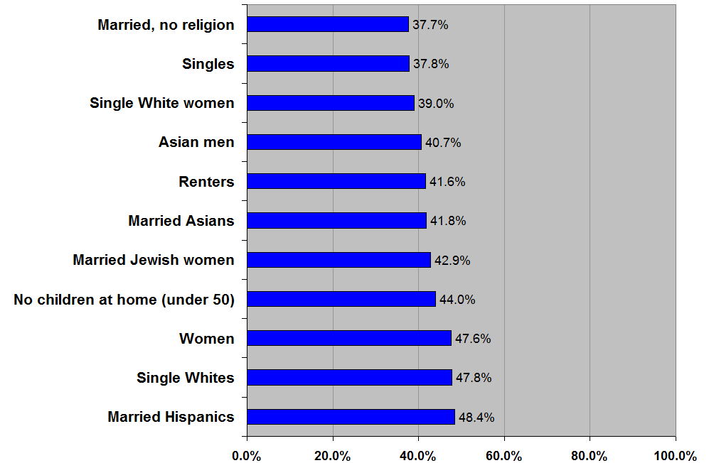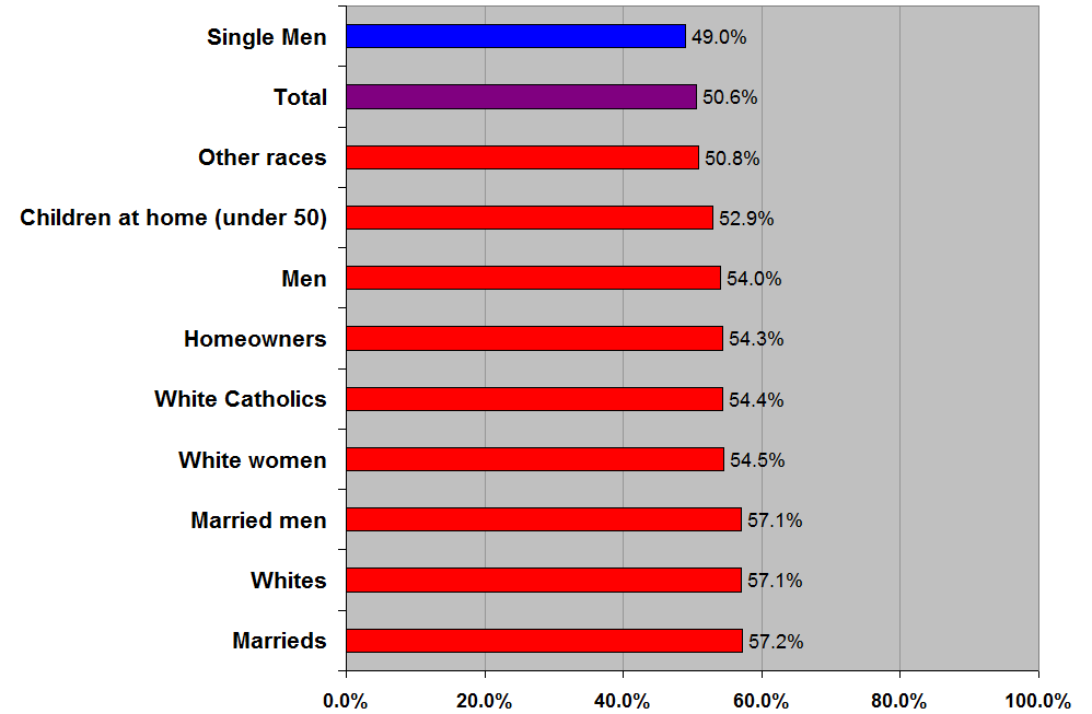 Damn, it's amazing that the percentage for married black men is almost as high as single women. You always think of blacks as being an automatic vote for whatever Democrat is on the ballot but I guess other factors come into play.