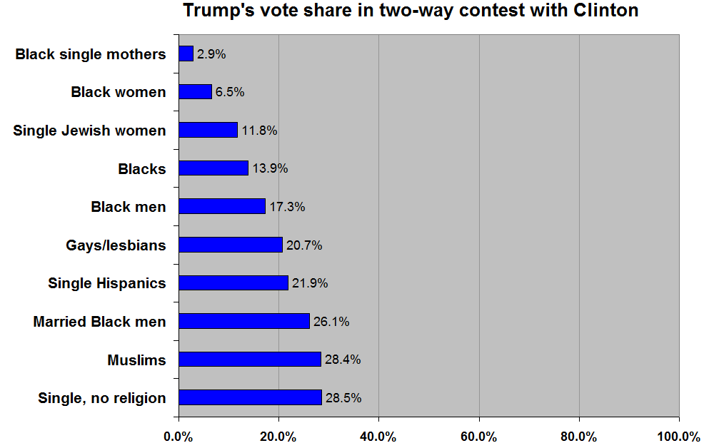 In imitation of Steve Sailer's--epigone, after all!--detailed demographic breakdown of the 2012 presidential election with Romney and Obama going head-to-head, here's a less aesthetically appealing version of the same for 2016 with Trump and Clinton squaring off.