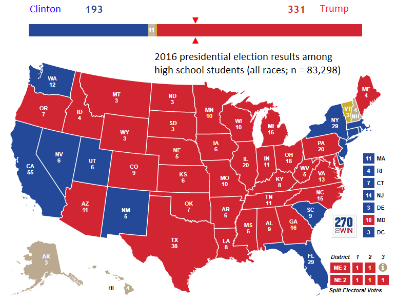 Delaware split evenly among whites and Vermont again went with a write-in. Clinton wins outright in Utah because girls primarily broke between her and McMuffin, while boys did so between Trump and the cuck.